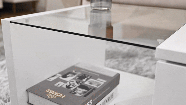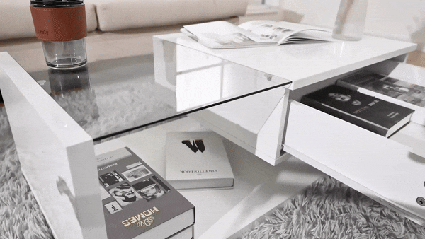 What sets our coffee table apart is its unique combination of high-quality materials and modern design. The tempered glass top ensures safety and durability, while the high-gloss wooden base adds a touch of sophistication. The ample storage space is cleverly designed to keep your living area organized and clutter-free.